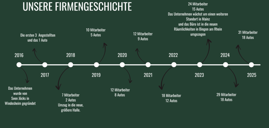 Heute – nur wenige Jahre nach der Gründung – zählen wir über 30 engagierte Mitarbeiter, einen modernen Fuhrpark und weitere Standorte in Bingen am Rhein und Mainz. Darauf sind wir stolz.